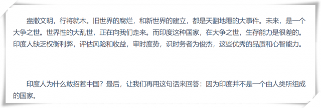 印度是世界的贫民窟,有着长达几千年的活死人鬼文化,我们弹指间就可以冲出亚洲,饮马印度洋,最后更是下出结论: