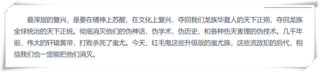 总之,在《至道学宫》的文章里,只有华夏族才是全世界最优秀的民族,外国人都是劣等人,所以我们必须要去解放全世界,去拯救全世界。
