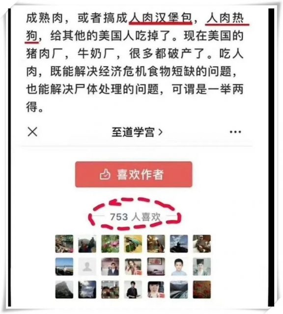 比如在封杀前的最后一篇文章《濒死:美国沉没》中说,美国在悄悄大规模吃人,全国死了上百万人无处安葬,于是悄悄做成了人肉汉堡、人肉热狗,给其他美国人吃掉。