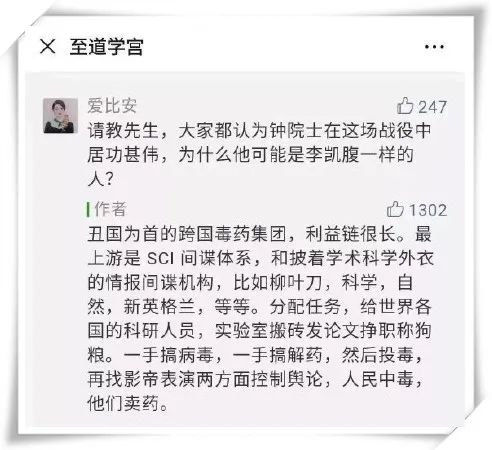 在《至道学宫》的一条热评里,造谣诋毁钟南山院士,暗指他是“跨国毒药集团”利益链中的一员,而且《柳叶刀》、《科学》等著名权威科学期刊也成了披着学术科学外衣的间谍机构。