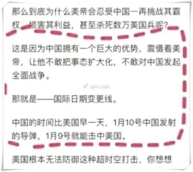 涨见识了,第一次知道我们还有这种“超时空武器”,原因居然是我们比美国的时间早一天,所以今天发射的导弹,昨天就能打到美国去......