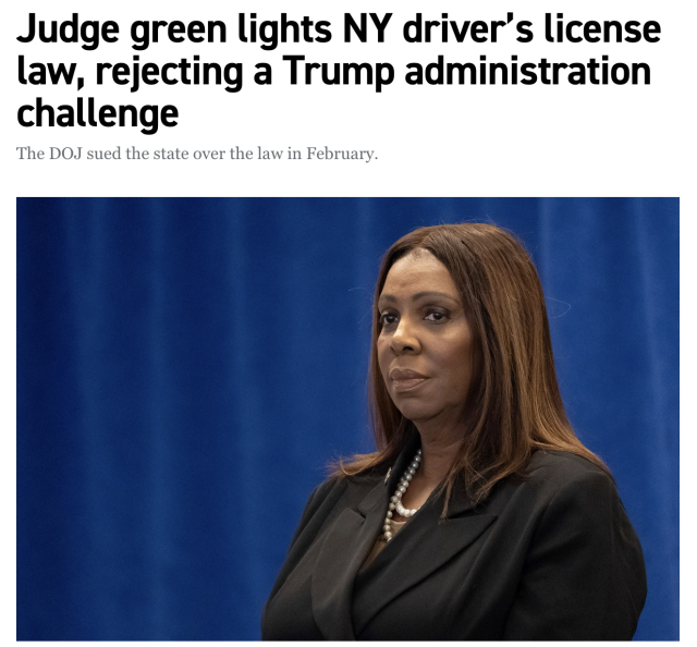 今年2月,美国司法部对纽约州州长凯西·霍楚(Kathy Hochul)和州检察长莱蒂西亚·詹姆斯(Letitia James)提起诉讼。时任司法部长帕姆·邦迪声称,这项州法律“将非法移民置于美国公民之上”,并阻碍联邦特工在交通拦截中查看非法移民的犯罪驾驶记录。司法部强调,该法律“正面攻击联邦移民法及其执行机构”,尤其是要求州DMV在联邦移民机构查询非法入境者信息时必须通知申请人这一条款。