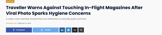 原本用来提升旅行体验的机上杂志,如今却因这一张照片,让不少人彻底“下头”。对于越来越注重卫生与健康的旅客来说,这次疯传的提醒,或许真的会改变他们今后在机舱里的一个小习惯——