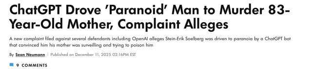 本案是美国目前日益增多的“AI致死(wrongful death)”案件之一,也是全美首起指控AI聊天机器人导致他杀(homicide)的诉讼。截至目前,美国至少已有七起声称ChatGPT诱发自杀或妄想的诉讼,另一家AI公司Character Technologies也面临多起类似案件。
