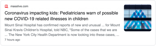 根据NBC New York报道,位于长岛的科恩儿童医院(Cohen Children’s Hospital)在过去两周内也发现了大约12名危重症儿童患者出现了类似的炎症症状。