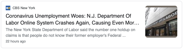 据PIX11报道,因新型冠状病毒肺炎疫情影响,新泽西州失业人数持续增加,周日(5月3日)新泽西州劳工厅(New Jersey State Department of Labor)失业救济金申请网站再度崩溃瘫痪。