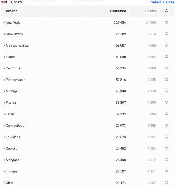其中纽约州累计确诊327454例,死亡24999例;新泽西州累计确诊病例128269例,死亡7910例;康涅狄格州累计确诊病例29973例,死亡2556例;宾夕法尼亚州累计确诊病例52816例,死亡2838例。