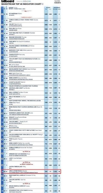 Billboard(公告牌排行榜)作为世界最著名的音乐排行榜,已有超过百年的音乐工业数据统计和榜单发布的历史,其制作的各类反映当今世界各类型音乐趋势的专业榜单多达200多个,包括流行榜、摇滚榜、嘻哈榜、专辑销售榜等、是美国以及整个世界流行乐坛最具权威的排行榜,没有之一。Billboard以全美几千家商业电台的播放量为主要依据,结合下载量以及流媒体的播放量得出每周排名。电台听众对歌曲的喜爱程度以及点播量直接决定了单曲在电台的播放次数,Billboard Top 40 流行指数榜(Indicator Chart)可以说是行业风向标,从新歌当中排出当下最受欢迎,以及最有可能成为爆款金曲的前40首歌。