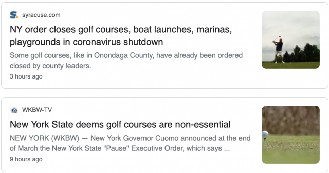 与此同时,该指南明确指出,高尔夫球场属于非必要场所,包括纽约上州奥内达加郡(Onondaga County)在内的部分高尔夫球场已经被当地有关部门下令关闭。尽管郡官员听到了高尔夫球友们的反对之声,但其他郡也纷纷效仿,目前纽约州已获准同意关闭。