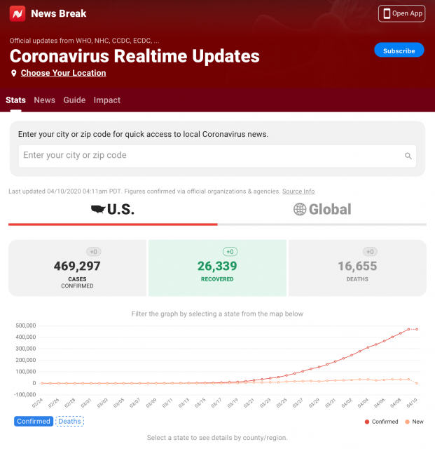 据News Break报道,根据WHO、NHC、CCDC、ECDC等官方数据,截止美国东部时间4月10日凌晨4:44,美国新冠累计确诊469297例,死亡16655例,康复26339例。