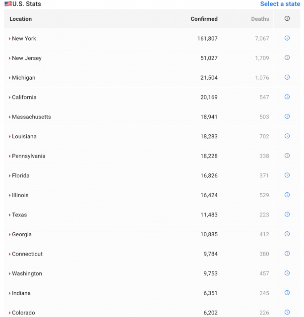 其中纽约州累计确诊161807例,死亡7067例,超过了除美国以外的任何国家;新泽西州累计确诊病例51027例,死亡1709例。