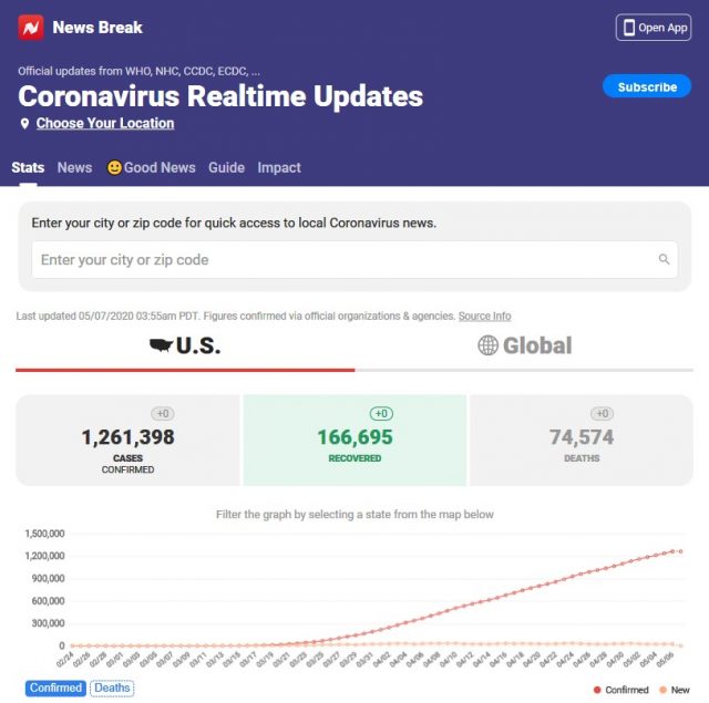 据News Break报道,根据WHO、NHC、CCDC、ECDC等官方数据,截止美国东部时间5月7日凌晨3:55,美国新冠累计确诊1261398例,死亡74574例,康复166695例。