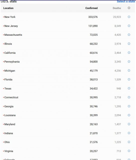 其中纽约州累计确诊333576例,死亡25923例;新泽西州累计确诊病例131890例,死亡8549例;康涅狄格州累计确诊病例30995例,死亡2718例;宾夕法尼亚州累计确诊病例54800例,死亡3345例。
