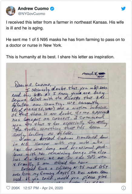 纽约州长葛谟在4月24日的疫情发布会上阅读了整封信,赞叹瑞尼克的行为,在当下艰难时刻,带给人们勇气和温暖。