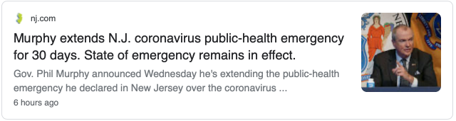 墨菲宣布,原定于本周四(5月7日)到期的新州公共卫生紧急状态将再延长30天。将确保在未来一个月继续保持目前的战备状态。新州仍然处于公共卫生紧急状态。墨菲周三签署的行政命令将至少持续到6月5日。新州的紧急状态将无限期维持,但墨菲表示,公共卫生紧急状态将在30天后结束。