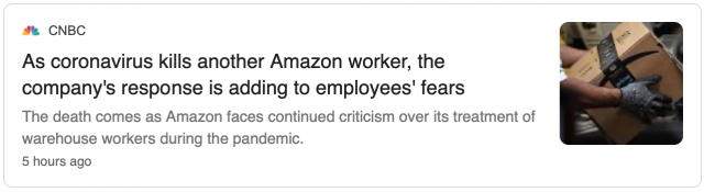 4月初,史坦顿岛亚马逊仓库50名员工罢工抗议,亚马逊遂决定对出现新型冠状病毒肺炎症状和确诊新型冠状病毒肺炎的员工,提供2周带薪假期。