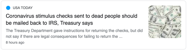 美国中文网综合报道,美国国税局(Internal Revenue Service)在周三发布的新指南中表示,家人必须退还发给已故者的联邦刺激纾困款。为了尽快发放刺激款项,一些钱被寄给了已去世但在过去两年内有报税记录的人,而与此同时数百万人继续等待他们的款项。该机构还于周三澄清说,可能已经收到款项但没有资格的领取的其他人包括被监禁的人,也必须归还这笔钱。