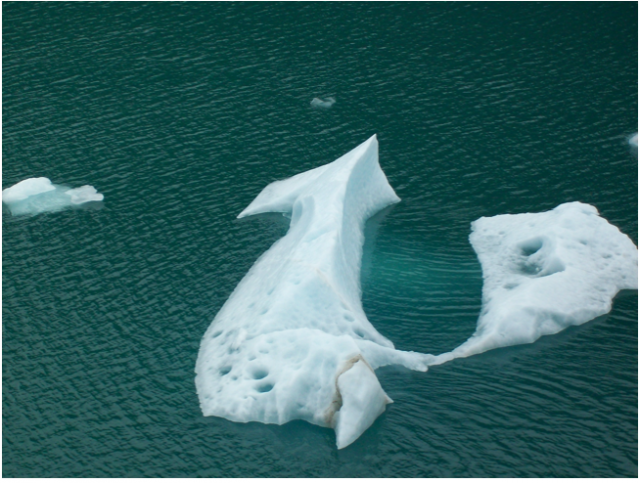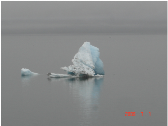 在夏季,随着气温上升,冰川上会出现裂纹,裂纹逐渐扩大,最后大块冰就从母体上崩裂。这种情况随时可能发生,但是由于逗留时间限制,又不是每个游客能够幸运地看到。这时候,从我们游艇后面的那条小快艇上放下两个橡皮艇,每条艇上载着5-6个人在浮冰的缝隙中穿行,驶向冰川方向,去近距离观察冰川。我不知道这些人是专业科考人员还是普通游客,如果是游客,那应该称得上是勇敢者或冒险者,因为冰川崩裂时激起的大浪和浮冰的异常快速移动会使橡皮艇出现不可预测的危险。也许他们本来就不是游客,是一些专家,承担的是科学考察任务。那又当别论,他们是负有使命,明知山有虎,偏向虎山行。我用望远镜注视着这两个橡皮艇渐渐接近那巨大的城墙一般的冰川,最终消失在密集的浮冰后面。我心存挂念,不知道下一拨冰川崩裂的巨大的涌浪会不会对他们造成危险?