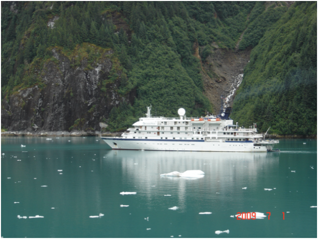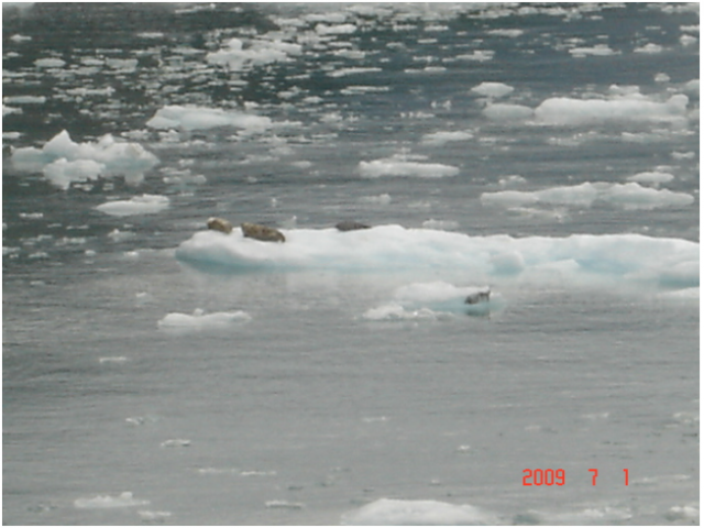 海面上开始出现浮动的冰块。先是零星小块浮冰,渐渐地冰块多了起来,而且有较大块浮冰出现。有的大块浮冰上栖息有海狮和各种水鸟。由于冰的比重大约是0.86克/立方厘米,比水的比重轻约七分之一,所以露出在海面的冰块只是全部冰块的七分之一,大部分冰块在海水下面。我们抓拍从船边快速流过的各种不规则造型的冰块。此时的景象令我想起电影《冰海沉船》里一个镜头:穿着厚厚棉大衣的了望哨,在黑暗中坐在坦泰尼克号全船最高的哨位上,睁大眼睛透过浓雾观察前方海面,突然发现黑呼呼的冰山已经近在眼前,惊慌失措地向船长报告,前方发现冰山,那时大意的船长在睡觉,值班大副紧急命令刹车和转向,也已经来不及避让,巨轮上部虽然从冰山边上擦过,然而冰山海水下的部位撞破了船头下侧好几个舱位。海水大量涌入,一场悲剧由此而生。虽然现代化的邮轮,配备了多普勒全方位雷达,可以远距离发现漂浮的冰山,黄金公主号邮轮船长还是精神抖擞,不敢大意。后来我看到船长的航行日志中记载,由于雀莱西海湾雾大,冰情复杂,从全船游客安全出发,在早晨6:15时,船长决定临时改变航向,把船开往恩迪库特海湾(Endicott Arm)。