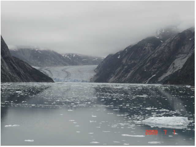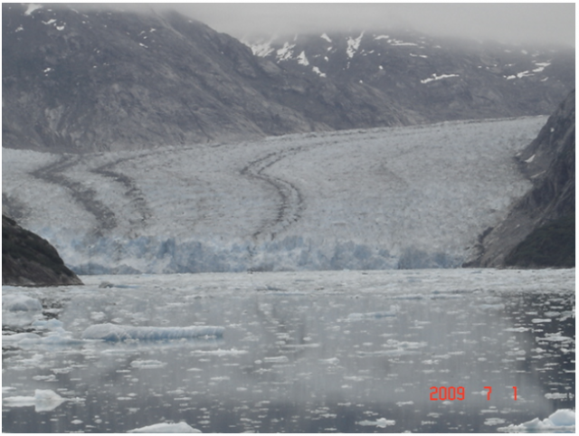 眼前的一幕勾起我一段往事的回忆。两年前,那是2007年的6月,我随沁园集团董事长叶先生考察新疆天山一号冰川时,夜宿在冰川脚下海拔2000多米的中科院冰川研究站,与站长和他手下的年轻的男女博士研究生们一起生活过一天。白天,我们向他们学习了许多有关冰川的知识,知道冰川有高山型和海洋型,我们中国天山上的冰川是高山型,是离海洋最远的冰川。而像阿拉斯加的冰川大多是海洋型,高纬度,低海拔,许多冰川直通海洋。冰川科考的危险艰辛和甘于寂寞的生活非常人所能承受,为了准备第二天上冰川,避免可能出现的高原缺氧反应,那一天的晚餐,站长特意为我们准备了用雪莲花和红景天浸泡多时的60度烈性烧酒,一定要我们开怀痛饮,说是有助于克服高原反应。酒足饭饱后又一改冰川站日常枯燥寂寞的生活,一起联欢。那一天我也是学学苏东坡“老夫聊发少年狂”,既喝酒又唱歌,载歌载舞到夜深。