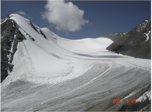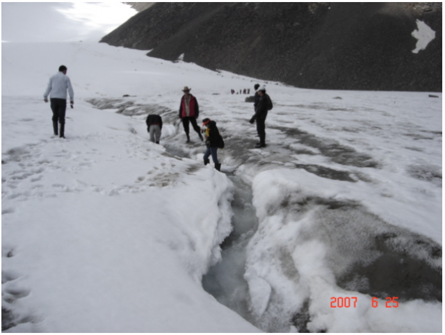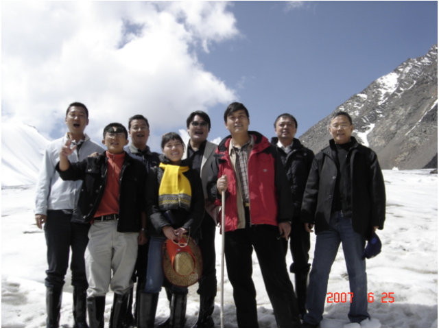第二天越野车把我们送到冰川脚下,余下的500多米山路只能步行。我和队友一行8人,穿上滑雪衫,背上登山包,在冰川站博士们的引领下,克服冰川上气温低,坡度陡,冰面滑,冰河挡道等困难,一步一个脚印,有时候手足并用地攀登上了海拔4300多米的冰川,领略了天山冰川宏伟壮观的美景,观赏了蓝色晶莹剔透的冰洞,品尝了冰川融化后那甘甜沁人心肺 的冰川水,目睹了冰川退缩后显露出苍劲荒凉的峡谷地面上破碎的冰磧石。高山上的气候多变,早上,爬冰川时,蓝天白云,白雪皑皑的冰川美景如画,中午时分下冰川时,天气阴沉飘了一阵雪花。那一年,我六十一岁,在登冰川时,除了有些气急,脸色有些苍白外,没有其他异常感觉,从冰川上下来,在紧靠冰川脚下的一个维吾尔族老乡的圆形毡包里休息午餐,吃抓羊肉,喝奶茶,都感觉很好,可是后来傍晚时乘车下山反而感到有些头痛难受。据冰川站博士讲,那是下山太快的缘故。