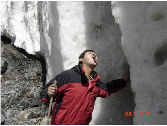 图12 叶董在品尝甘甜的冰川水