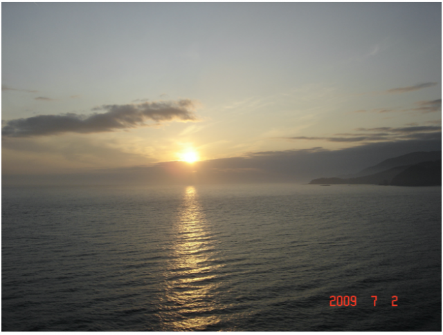 周三(7月1日)清晨,在充满期待中,我们夫妇俩登上甲板观景。 天空阴沉,海面上有浓雾,只能隐隐约约地看到周围岛屿的轮廓线。气温比昨天明显降低,即使穿着滑雪衫,在船头的迎风面上,仍然感到寒气逼人,冻得手脚发麻。