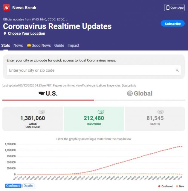 据News Break报道,根据WHO、NHC、CCDC、ECDC等官方数据,截止美国东部时间5月12日凌晨4:33,美国新冠累计确诊1381060例,死亡81545例,康复212480例。