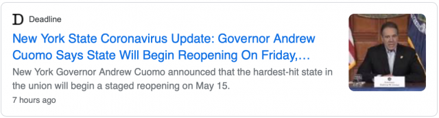 3. 库默表示5月15日暂停令到期后,符合州府公布的七条复工标准的地区可以率先分阶段复工。目前全州已经有Finger Lakes、Southern Tier和Mohawk Valley三个地区全部达标。州府也将在各地区成立复工监控室(Control Room),由当地民选官员监控复工时期的疫情指标,如果发现疫情反弹,将立即叫停或者减缓复工。