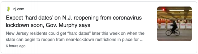 新泽西州州长墨菲(Phil Murphy)表示,近几周的封锁令减缓了疫情的爆发,每天新增病例的数量呈下降趋势。墨菲表示,新病例的数量持续的放缓,整个州的疫情传播速度有所放缓。