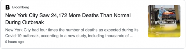 根据CDC发布的纽约卫生与心理卫生部的一份报告,从3月11日至5月2日,纽约市总共有32,107人死亡,比预期死亡人数多24,172人。尽管18,879例超额死亡的确诊或疑似病例与新冠病毒明确相关,但仍有5293例其他原因造成的额外死亡。