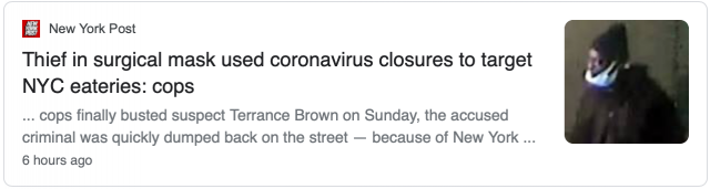 据警方描述,4月21日晚间10点左右,曼哈顿上西区,阿姆斯特丹大道(Amsterdam Avenue)1018号,马洛·比斯特拉餐馆(Marlo Bistro Restaurant),布朗潜入潜入店内,盗去500美元现金和2个iPad。布朗做案时脸上会戴着手术口罩,通常会在前门打碎玻璃门后潜入店内盗窃。
