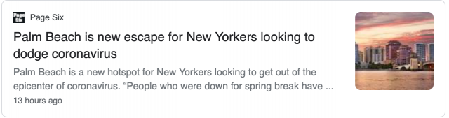 房地产经纪人科赫(Dana Koch)说道:“人们去那儿本来是要渡过春假的,但纽约州新型冠状病毒肺炎疫情突然爆发且持续恶化,最后人们就干脆待在那儿躲避疫情了。过去30天内,有很多纽约州车牌的车,从纽约州来的人太多了。有对夫妻本来要去纽约市长岛汉普顿(Hamptons),最后放弃了,在棕榈滩付了一年的房租。还有一对夫妻也这样做了,人们现在对自己的健康和生活质量非常看重。”