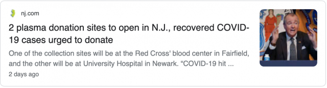 侨报纽约网报道,新州5月11日开放两个新冠康复者血浆捐赠点,一个在费尔菲尔德镇(Fairfield),另一个在纽瓦克大学医院(University Hospital in Newark)。