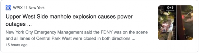 据PIX11报道,爱迪生电力公司(Con Edison)表示,凌晨4点左右,工作人员正在事故现场进行调查,事发地点位于中央公园西路(Central Park West)和西108街(West 108 Street)的交叉口附近。