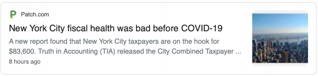 纽约市是报告中唯一一个在年度财务报告中包括相关实体的城市,这意味着纽约市83,600美元的纳税人负担仅由城市和州的债务组成。虽然纽约市的纳税人负担为63,100美元,但一旦加上20,500美元的州政府债务,纳税人的总负担就会跃升至83,600美元。