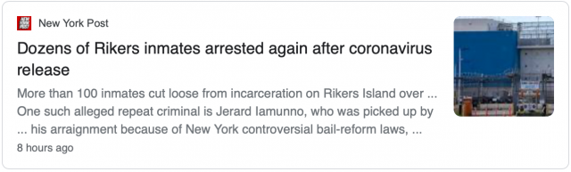 据侨报纽约网报道,3月下旬,因担心新冠病毒感染,大批囚犯从雷克岛监狱(Rikers Island)被释放,警方称,其中一些人又再度被捕。