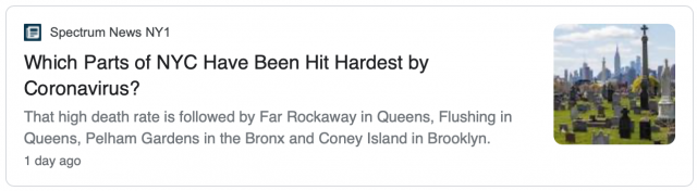 据侨报报道,纽约市卫生局公布的统计数据显示,布碌仑东纽约(East New York)、东北部布朗士(Northeast Bronx)、皇后区洛克威尔(Rockaway)、法拉盛(Flushing)和东阿姆赫斯特(East Elmhurst)是新冠病毒死亡率最高的地区,这些地区同时也是贫困率最高,以及少数族裔和新移民聚集的地方。