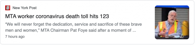 据纽约邮报报道,新型冠状病毒肺炎疫情在纽约市爆发以来,大都会运输署(MTA)请病假员工高达8700人,但大部分都已经返回工作,但有123名员工感染新型冠状病毒肺炎死亡,其中3名死亡员工来自地铁系统和公交系统。