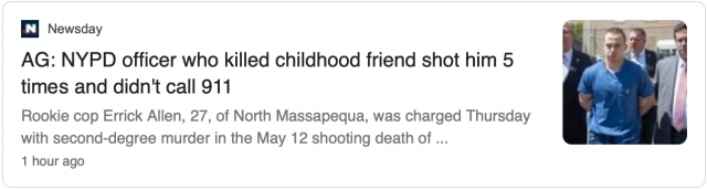 据纽约邮报报道,5月12日晚间8点左右,长岛纳苏郡(Nassau County),法明代尔(Farmingdale),兰登路(Langdon Road),一幢住宅房屋门前街道上,纽约市警局26岁休班警员埃里克·艾伦(Errick Allen),持枪朝25岁男子克里斯·克尔罗(Chris Curro)连开5枪,致使其当场死亡。