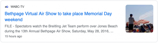 贝斯佩奇联邦信贷联盟( Bethpage Federal Credit Union)和纽约州公园、娱乐及历史保护办公室(New York State Office of Parks, Recreation and Historic Preservation),举办贝斯佩奇网络飞行展(Bethpage Virtual Air Show)。