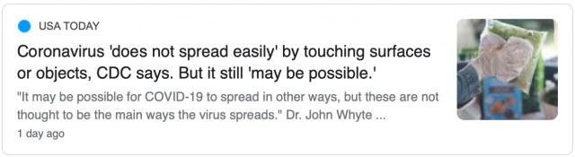 据今日美国报道,CDC在其官网上悄然改变了关于传播途径的措辞。最新指引说:“ COVID-19是一种新疾病,我们仍在研究它的传播方式。” “ 它可能以其他方式(非口沫)传播,但这些都不是病毒传播的主要方式。”