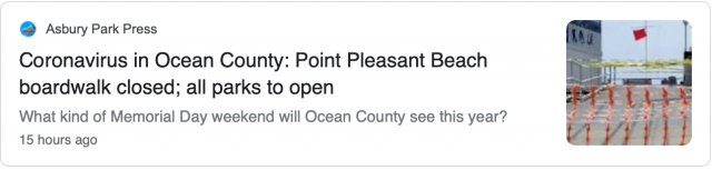 该县最后一批需要重新开放的公园是波因特普莱森特的海狸坝县公园(Beaver Dam County Park)、斯塔福德的保罗金县立公园(Paul King County Park)、;曼托洛克桥县立公园(Mantoloking Bridge County Park)和钓鱼码头、和波因特普莱森海滩的鸥岛县立公园(Gull Island County Park)。