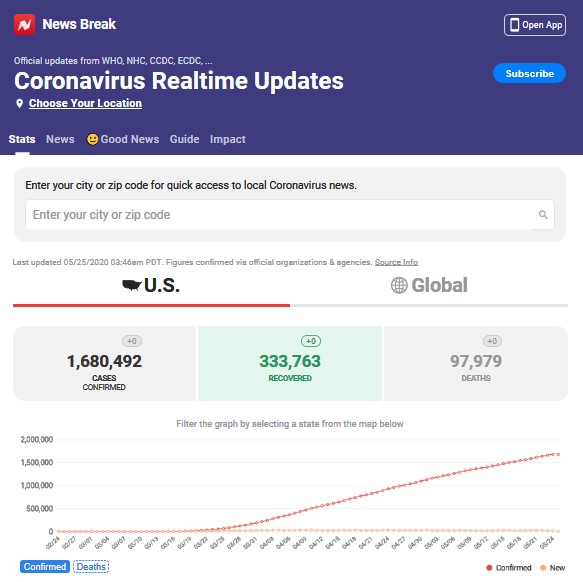 据News Break报道,根据WHO、NHC、CCDC、ECDC等官方数据,截止美国东部时间5月25日凌晨3:46,美国新冠累计确诊1680492例,死亡97979例,康复333763例。