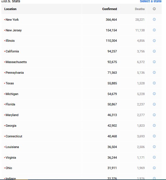 其中纽约州累计确诊366464例,死亡28221例;新泽西州累计确诊病例154154例,死亡11138例;康涅狄格州累计确诊病例40468例,死亡3693例;宾夕法尼亚州累计确诊病例71563例,死亡5136例。