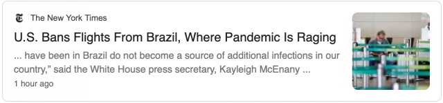 川普上周告诉记者,他的政府正在考虑暂停从巴西出发的旅行,巴西已经报道有超过2.25万人死于新冠病毒。