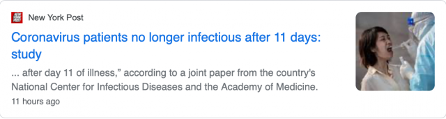 据《纽约邮报》报道,新加坡国家传染病中心和医学研究院(National Center for Infectious Diseases and the Academy of Medicine)联合发表的一篇论文显示,新加坡传染病专家表示,他们发现该病毒“在感染第11天之后无法分离或培养”。