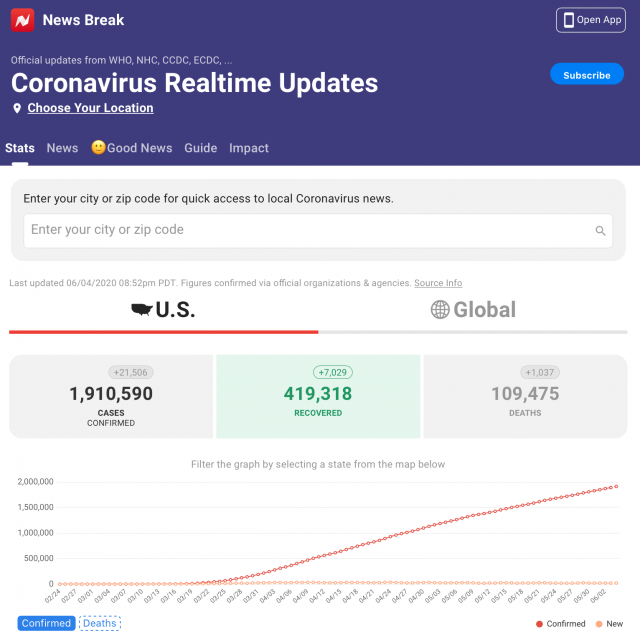 据News Break报道,根据WHO、NHC、CCDC、ECDC等官方数据,截止美国东部时间6月4日晚上8:52,美国新冠累计确诊1910590例,死亡109475例,康复419318例。