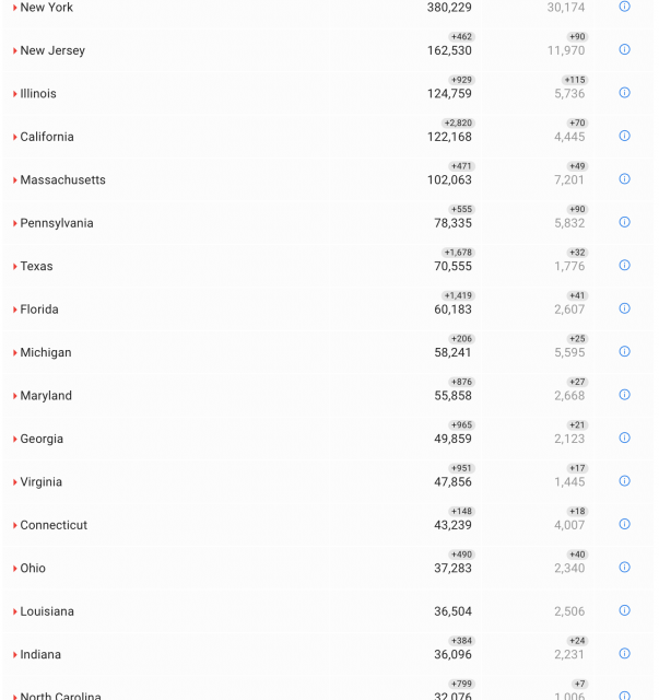 其中纽约州累计确诊380229例,死亡30174例;新泽西州累计确诊病例162530例,死亡11970例;康涅狄格州累计确诊病例43239例,死亡4007例;宾夕法尼亚州累计确诊病例78335例,死亡5832例。