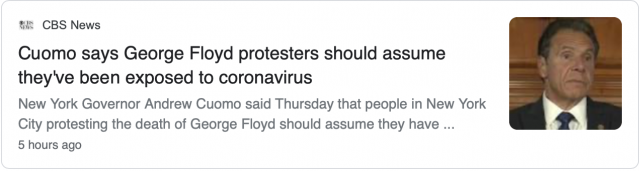 库默表示,全纽约州粗略估计有30000名抗议者,仅纽约市就有约20000名抗议者,大量的聚集可能导致疫情加剧,让目前的形势变得更加复杂。库默宣布,将扩大新冠检测范围,所有参加抗议游行的人都需要进行检测,以防超级传播者的出现。